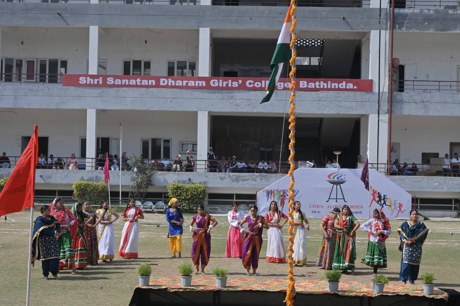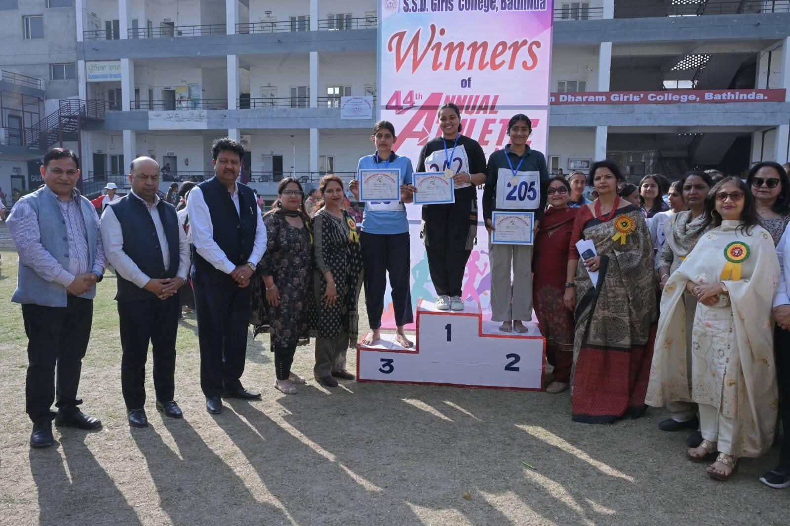 The chief Guest of the event was Ms. Avneet Kaur Sidhu (A.I.G. Counter Intelligence, Punjab) and the Guest of Honour was Adv. Abhey Singla (President, S.S.D. Sabha).S.Barinder Singh(District Social Justice and Empowerment officer Bathinda) and Ms. Mamta Sethi(DEO(Secondry) ,Bathinda) were Special Guests.Sh. Sanjay Goyal (President, SSDGGC) welcomed the guests. The events started with March-Past by the athletes and the Chief Guest took the salute from them. The Chief-guest declared the Sports Meet open and hoisted the flag. Praveen Kaur (B.A II)successfully conducted the Torch Lightning Ceremony followed by the Oath taking Ceremony.After the National Anthem, there were dance performances by students. Total 10 sports events took place in which the students performed in various sports events with full enthusiasm and sportsmanship. The Winners of the events were honored with medals in the following events:-